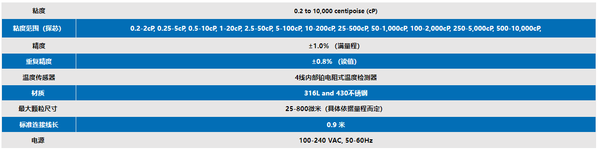 可在12個重疊的20:1粘度范圍內(nèi)進行測量。粘度可顯示為厘泊(cP)或厘斯托克斯(cSt),溫度可顯示為攝氏度(℉)或華氏度(℃)。